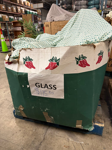 Various types of glass items. Drinking glasses, vases, plates, bowls, etc. New and used, good condition, no broken glass. Sold by the Pound. When you place an order you have 2 business days to pick up your pallet. The pallet has to be emptied the day of pick up or you can pay an extra $25 deposit fee for the box and pallet to be loaded onto a truck or trailer. Once the pallet and box are returned we will refund the deposit. |