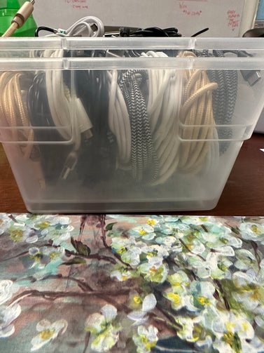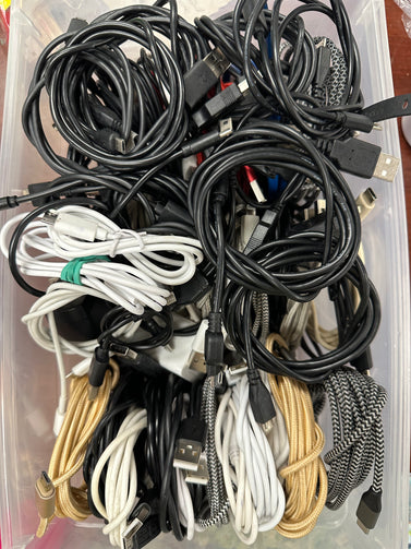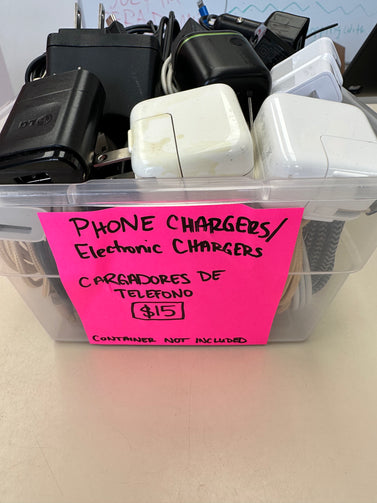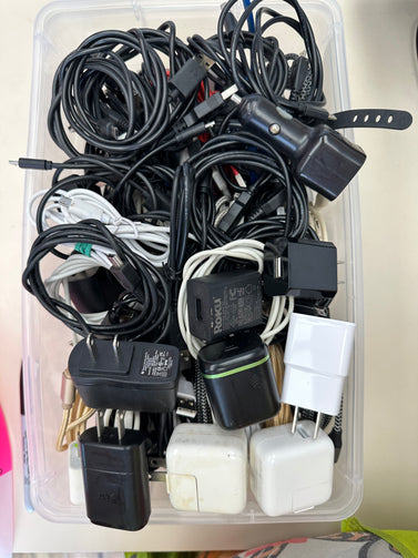 Small container with iPhone and Samsung chargers. Container not included. New and old style chargers. Contenedor pequeño con cargadores de iPhone y Samsung. Contenedor no incluido. Cargadores de estilo nuevo y antiguo.